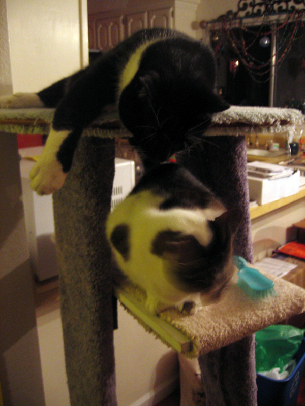 No, I lie. He didn't do all these things just any abstract you. He did these things primarily to me me. He was nice to Sandi, and could be warm to other people, but we bonded with each other rapidly and completely. Even his annoyances were endearing - lifting up to as if to open a doorknob, shoving his way into the broken bathroom door and letting the cold in while you showered, hitting you with an oddly concerned "mrowr" (sounds like "meringue") that for all in the world seemed like he was saying, "you damn fools, what are you doing in all that water? Can't you see it's made all your fur come off?"