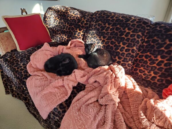 We separated them, and everyone calmed down. Apparently this backsliding is a thing that can happen when introducing cats, and you need to be willing to do a reset. But, despite the calming down, it took a week or so for Lovi to start warming back up again. She used to hop up on Sandi's lap, but quit that when she was introduced to the kittens. She refused to do that for me, and Sandi realized that the blanket we had on the chair where I read in the bedroom likely smelled of kitten. I replaced that cover with a new blanket, and within the day Lovi had hopped up on it and started making biscuits and rubbing on my hand.