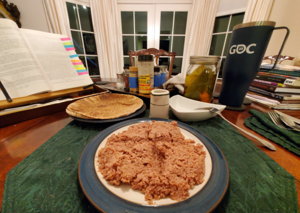 Now, you'd be surprised, but kibbey nayye made from Beyond Beef is every bit as good as regular kibbey - so much so that I keep a pack or two of Beyond in the freezer just so I can make vegan kibbey nayye on any occasion. The recipe is dead simple: thaw out one packet of Beyond Beef in the fridge, wash one cup of fine bulghur wheat three times, soak with a fingersbreadth of water until absorbed, and drain; grate one large white onion and drain (since the onion juice will overpower the mix), and mix the meat, onion and bulghur wheat together until very thoroughly mixed. Spice with a good bit of salt and pepper, a lesser amount of cumin and cinnamon, and a small amount of allspice (but NO NUTMEG, according to my recipe book), and adjust the mix to taste. Serve in a small mound with a cross cut in it, add a little olive oil, and eat with bread.