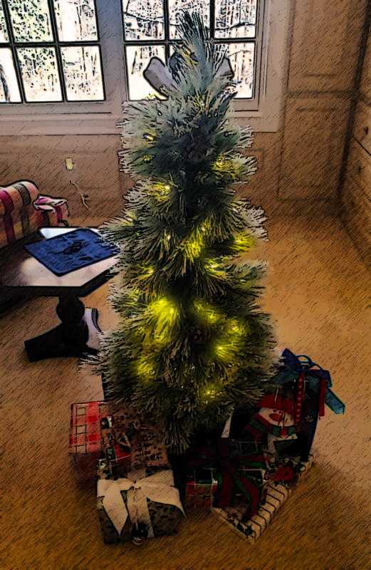 So! In lieu of a long blog post, enjoy this festive tree, which I had set up elsewhere in the house as a permanent accent slash night light years ago, but which my wife snuck up to our bedroom closet and loaded with gifts while I slept in the night ... because, while she's not into Christmas, she knows I am.