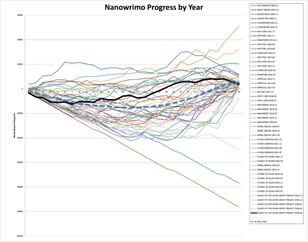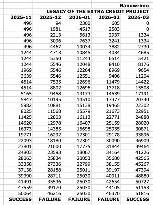 But I pushed through, and got close to my 50,000 words in February (a short month at that!) and nailed it in March. As of tonight, the last day in the 30-day challenge, I have written 51816 words on LEGACY in March and 242038 words (counting outline, notes, and such) in total.